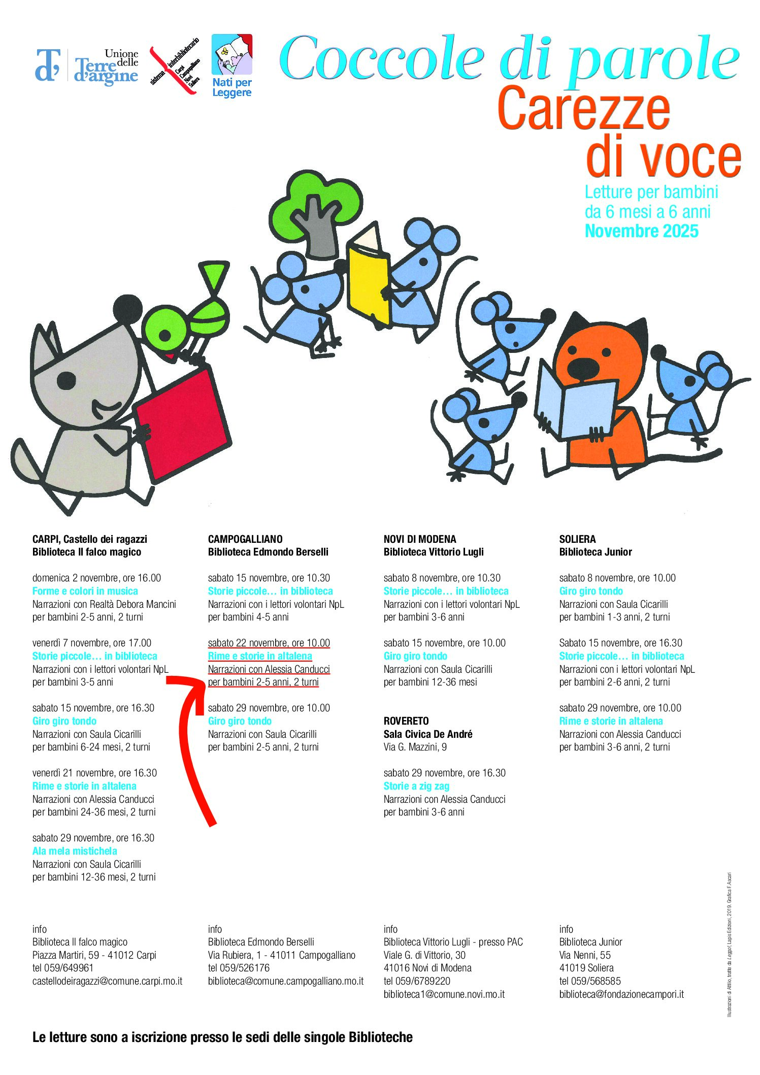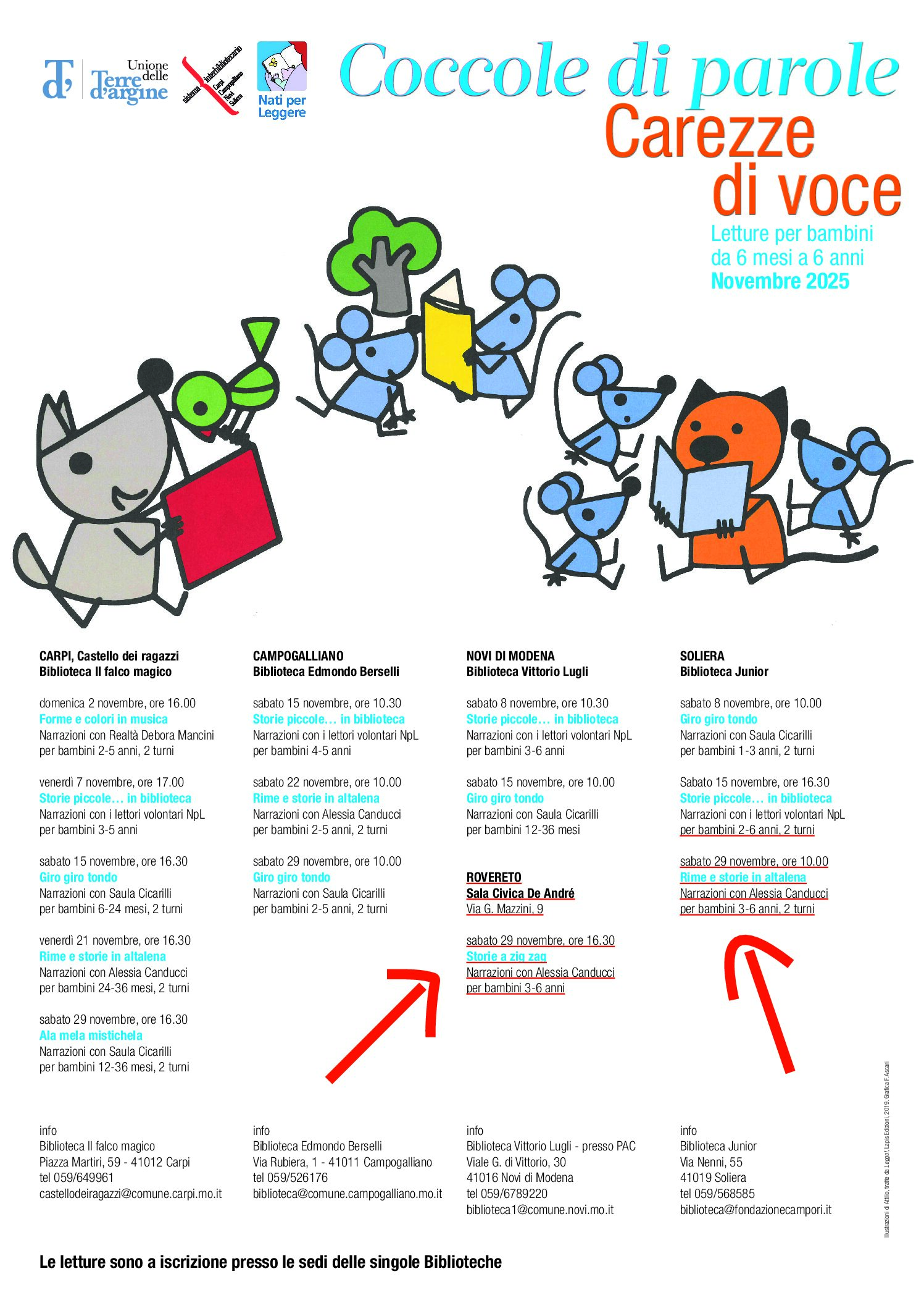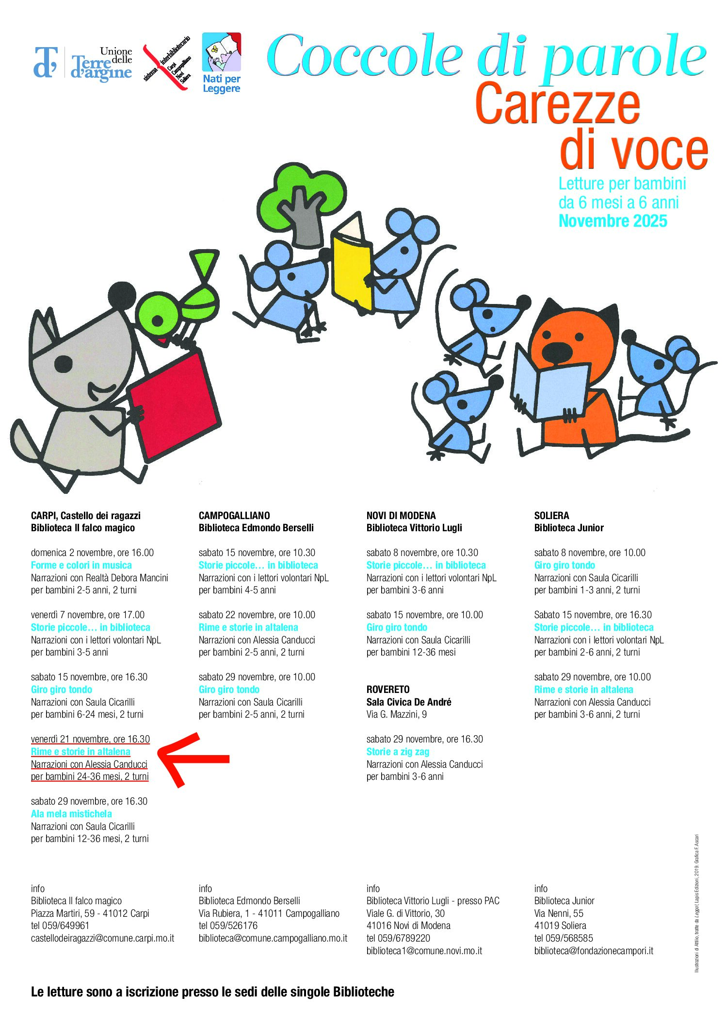 ore 10.00 SOLIERA Biblioteca Junior Rime e storie in altalena Narrazioni con Alessia Canducci per bambini 3-6 anni, 2 turni ore 16.30 ROVERETO Sala Civica De André Via G. Mazzini, 9 Storie a zig zag Narrazioni con Alessia Canducci per bambini 3-6 anni